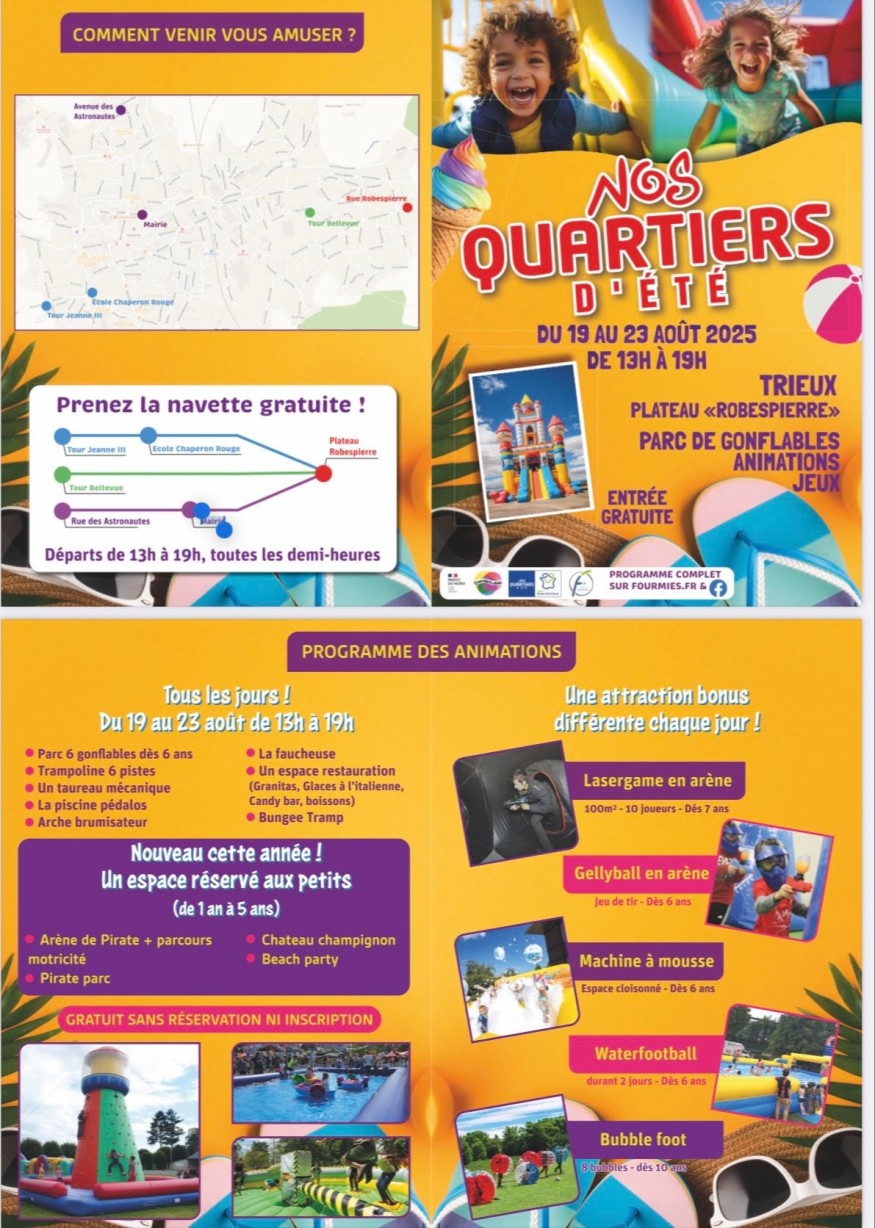 Rendez-vous plateau Robespierre jusqu’à ce samedi 23 août, de nombreuses activités gratuites seront proposées. Parc 6 gonflables dès 6 ans, trampoline 6 pistes, taureau mécanique, piscine pédalos, arche brumisateur, faucheuse, espace respiration. Une attraction bonus chaque jour : Lasergame en arène, Gellyball en arène, machine à mousse, Waterfootball, Bubble foot. Profitez d’une navette gratuite qui peut vous emmener au plateau Robespierre, des arrêts sont proposés Tour Jeanne III, école chaperon rouge, tour Bellevue, rue des astronautes et mairie, chaque demi-heure de 13h à 19h.