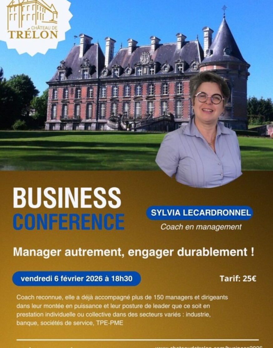 Vendredi 6 février, le Château de Trélon accueillera une conférence sur le leadership à destination des dirigeants et managers de l’Avesnois et des environs. Intitulée « Manager autrement, engager durablement », cette conférence sera animée par Sylvia Lecardronnel, sociopsychologue et coach en management, spécialiste du leadership moderne et de l’engagement des équipes. Rendez-vous à 18h30, au Château de Trélon. Informations et réservations sur chateaudetrelon.com.