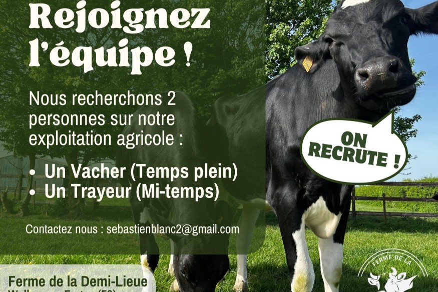 Wallers-en-Fagne : la SCEA La Demi-Lieue cherche des trayeurs.