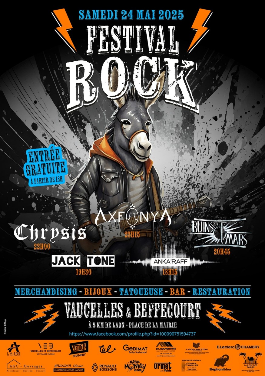 Dans ce village de 250 habitants basé dans le Laonnois, la population grandit chaque année à l’occasion de ce festival créé il y a 25 ans. 45 bénévoles qui s’emploient à préposer un festival familial. Rendez-vous place de la mairie de 18h à minuit ce samedi 24 mai. Avec même une mascotte, Archie, un âne, car le rendez-vous est prévu rue du pas d’âne. Citons notamment Axfonya, des locaux qui vivent dans le village, et qui proposent des compos entre rock et métal avec parfois des accents celtiques. Ruins of Mars, un power trio rock originaire de l’Aisne. Du heavy-Metal, avec Chrysis, de Champagne-Ardenne. Du rock alternatif avec Jack Tone, et Anka’Raff, reprises pop rock français/anglais.