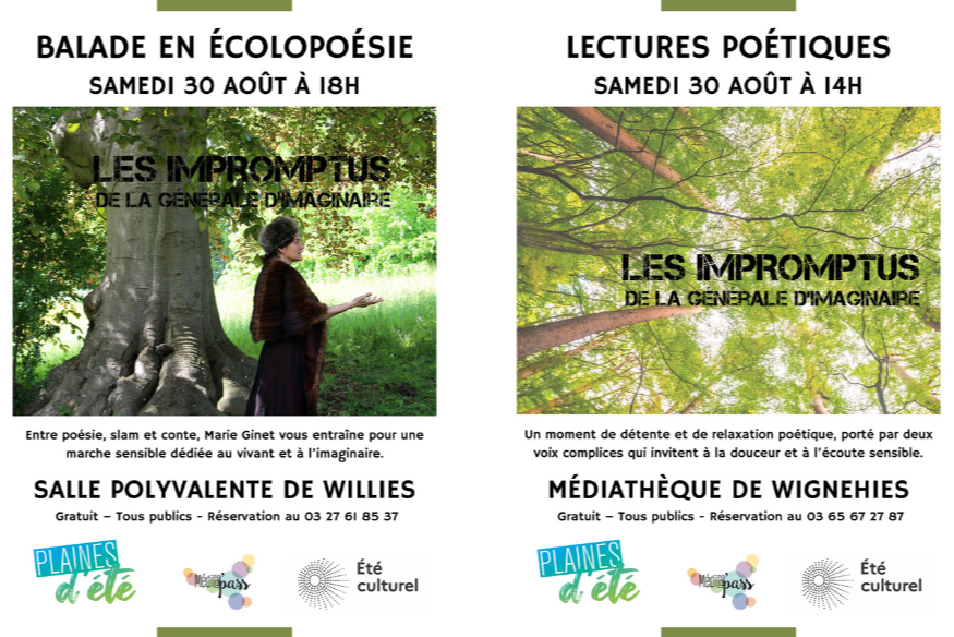 Samedi 30 août, 14h à la médiathèque de Wignehies : Lectures poétiques avec Marie Ginet & Sophie Boulanger. Mots murmurés, susurrés, chuchotés… installez-vous confortablement dans les transats... Un moment de détente et de relaxation poétique, porté par deux voix complices qui invitent à la douceur et à l’écoute sensible.