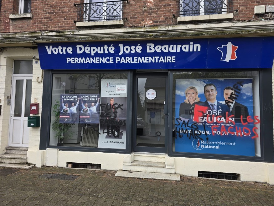 Des tags à la bombe ont été découverts samedi matin sur les vitrines de la permanence du député José Beaurain, avec des messages hostiles signés « antifa ». L’élu a porté plainte, une enquête est en cours. En réaction, José Beaurain dit sa colère et dénonce des actes « inacceptables », révélateurs selon lui d’un climat de plus en plus tendu à Chauny. Il évoque une montée de la violence verbale et accuse l’extrême gauche de méthodes qu’il juge inquiétantes. (Photo : Page Facebook du député)