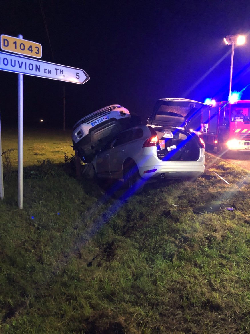 Dans la nuit du jeudi 25 au vendredi 26 septembre, les sapeurs-pompiers du Nouvion, renforcés par leurs collègues de Fesmy-le-Sart, Etreux et Etréaupont, sont intervenus sur la départementale 1043 suite à un accident impliquant deux véhicules. Le choc a été spectaculaire à l’arrivée des secours. Deux personnes ont été légèrement blessées et ont été prises en charge. (Photo : Centre de Secours du Nouvion-en-Thiérache)