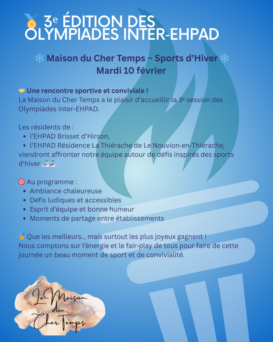 3e édition de leurs olympiades inter-établissements. Ce mardi 10 février, la Maison du Cher Temps à Vervins accueillera toute la journée l’événement, placé cette année sous le thème « Les habitants font du ski », en clin d’œil aux Jeux Olympiques d’hiver. Une dizaine de résidents par établissement participeront à des épreuves sportives, ludiques et cognitives, adaptées aux capacités de chacun, avant un repas partagé et une remise de prix. Les autres EHPAD du groupement, la Résidence Brisset à Hirson et la Résidence La Thiérache au Nouvion-en-Thiérache, prendront également part à cette journée conviviale, pensée pour renforcer le lien social et le bien-être des résidents.