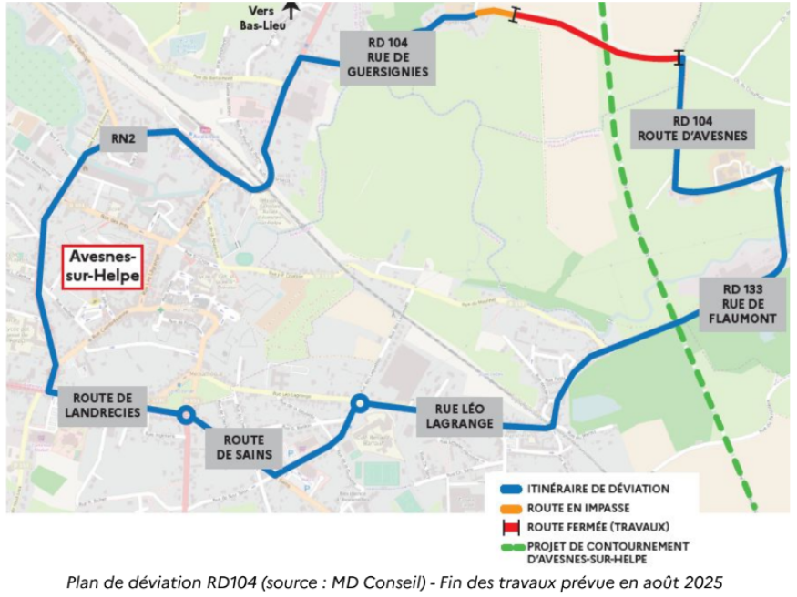 Les travaux de construction de l’ouvrage d’art permettant le rétablissement de la RD104 sous la future RN2 à Bas-Lieu arrivent à leur terme. L’ultime phase des travaux nécessitera une coupure de la RD104 et la mise en place d’un itinéraire de déviation. Depuis mi-octobre 2024, un ouvrage d’art est en cours de construction pour permettre le rétablissement de la D104 sous la future RN2 à Bas-Lieu. La dernière phase des travaux nécessitera la fermeture de la RD104 afin de réaliser son raccordement au nouvel ouvrage et les travaux de finitions. Une déviation sera mise en place du 16 juin au 1er août. Elle empruntera la D133 à Flaumont-Waudrechies, la rue Léo Lagrange à Avesnelles, la D951 et la RN2 à Avesnes. La mise en service de l’ouvrage prévue en août 2025 permettra la réouverture à la circulation de la D104.