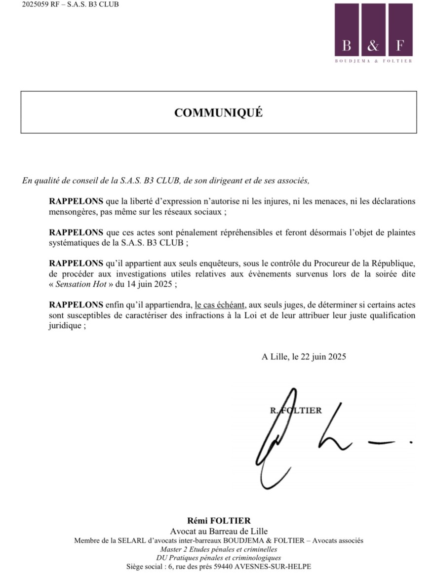 Dix jours après la soirée Sensation Hot qui a tant fait parler suite à plusieurs vidéos qui ont fuité, et qui laissaient apparaître des scènes sexuelles, Maitre Rémi Foltier, avocat au barreau de Lille, rappelle que la liberté d’expression n’autorise ni les injures ni les menaces, ni les déclarations mensongères, pas même sur les réseaux sociaux. Des actes pénalement répréhensibles, rappelle l’avocat, qui annonce qu’ils feront désormais l’objet de plaintes systématiques du B3 Club. Si l’on ne peut pas tout écrire sur les réseaux sociaux, c’est la justice qui tranchera dans ce dossier, si certains actes dans cette discothèque caractérisent des infractions à la loi.