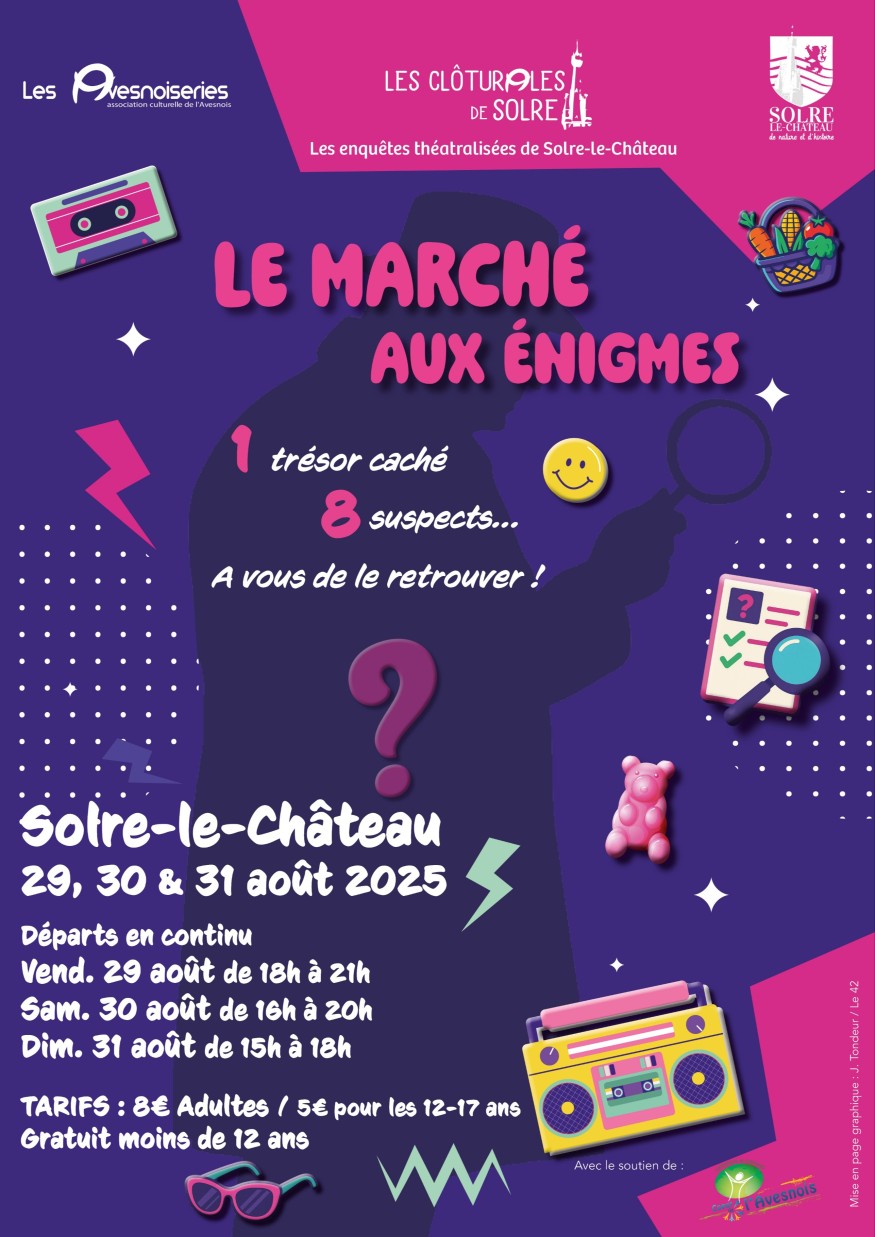 Dans le cadre des Clôturales de Solre-le-Château, Les Avesnoiseries proposeront ce temps fort avec une énigme à déchiffrer, 8 suspects à suivre, un trésor à trouver. Dans cette nouvelle enquête théâtralisée, plongez dans un marché en 1980 pour découvrir qui a caché un trésor dans la commune il y a 45 ans. Si vous êtes en panne dans votre enquête ? Passez voir les commerçants partenaires qui vous aideront sans doute pour trouver la solution. Départs en continu de 18h à 21h le vendredi / 16h à 20h le samedi et 15h à 18h le dimanche. Entrée 8€ (5€ pour les 12-17 ans / gratuit pour les moins de 12 ans).