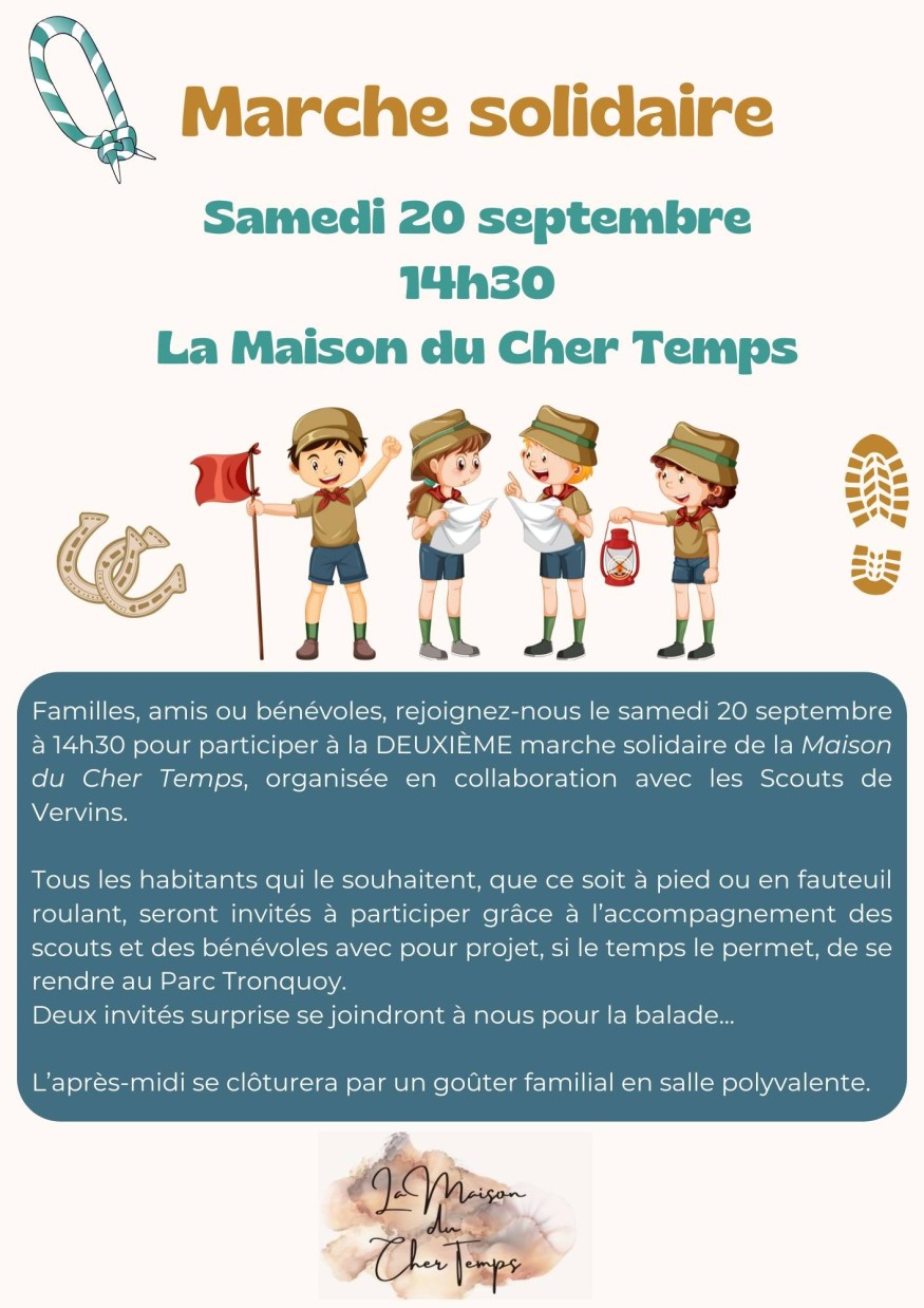 La Maison du Cher Temps, organise sa deuxième marche solidaire samedi 20 septembre à 14h30, en partenariat avec les Scouts de Vervins. Familles, amis et habitants sont invités à accompagner les résidents pour une balade conviviale jusqu’au parc Tronquoy. Deux invités surprises viendront agrémenter l’après-midi de bonne humeur et de magie. La journée se terminera par un goûter de crêpes offert à tous les participants.