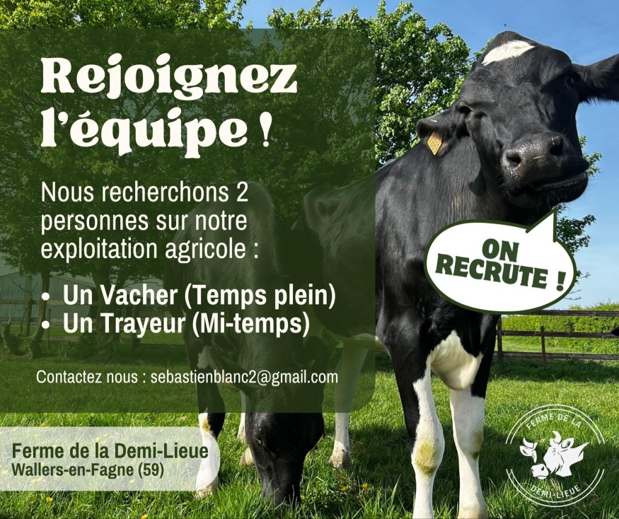 Wallers-en-Fagne : la SCEA La Demi-Lieue cherche des trayeurs.