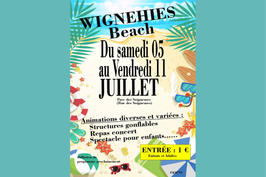 Avec le retour de Wignehies Beach, du samedi 5 au vendredi 11 juillet, parc et rue des soigneuses. Au programme : des animations, structures gonflables, repas concert, spectacle pour enfant. Le programme sera disponible très rapidement dans les commerces de la commune ainsi que sur la page Mairie de Wignehies…